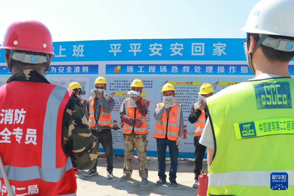 5月12日,中建二局工人在江苏无锡K11项目工地学习如何在遇到火情时开展自救。