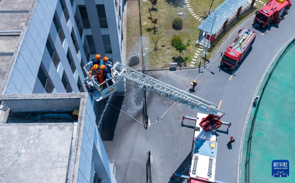5月12日,江苏省南通市通州区在江苏省通州中等专业学校开展2025年度校园火灾事故应急演练,消防队员在演练中利用云梯营救被困学生(无人机照片)。