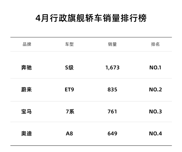 作为对比,宝马7系4月份交付761台,排名榜单第三;奥迪A8销量649台,位居第四。