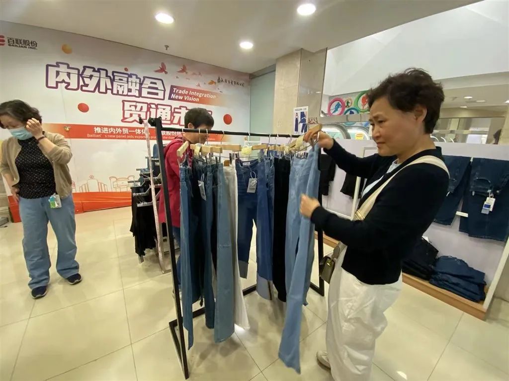 “我们是4月24日联系上永安百货的,仅仅用了一周的时间,商品就上架销售了。”宝玺集团负责人王诚伟告诉记者,其80%的出口业务面向美国市场,关税战致使公司对美业务全线受阻,大量原本出口美国的订单牛仔裤陷入滞销困境。一筹莫展之际,宝玺集团看到了百联股份转内销专班的消息,立即通过扫码填写企业诉求。