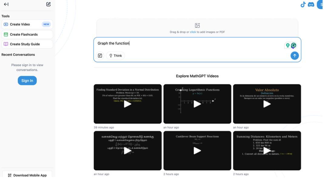 「MathGPT」不仅能解答数学问题,实际还涉猎到了物理、会计和化学等学科。其网页端流量更大的原因可能在于,其还侧重在“学”的功能设计,Web 端体现了大屏的优势。学习功能上,其支持一键生成视频来辅助理解有关概念,从官网展示的用户生成视频来看,用户集中在高中到大学低年级的学习阶段,涵盖了多个数学和物理学的基础主题。类似的功能还有,AI 生成学习指南、AI 生成图解、AI 生成练习测试/闪卡等。