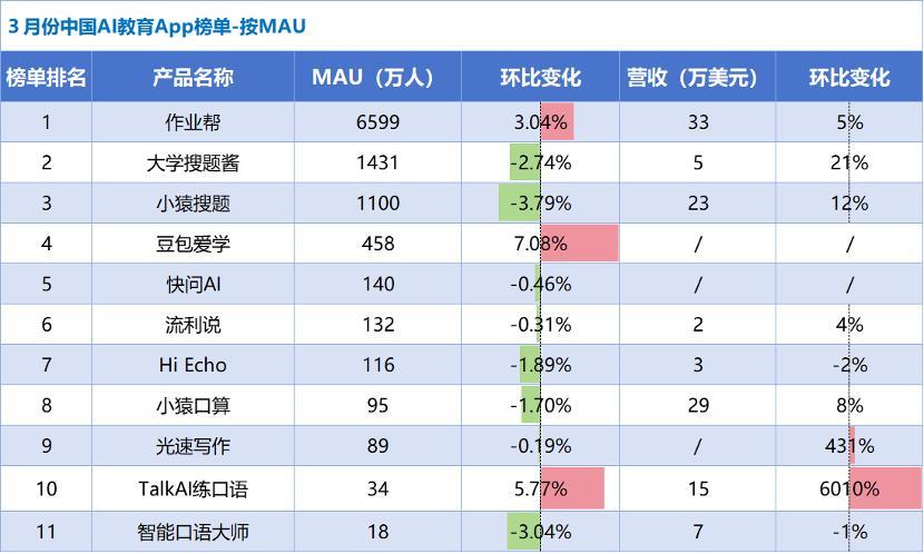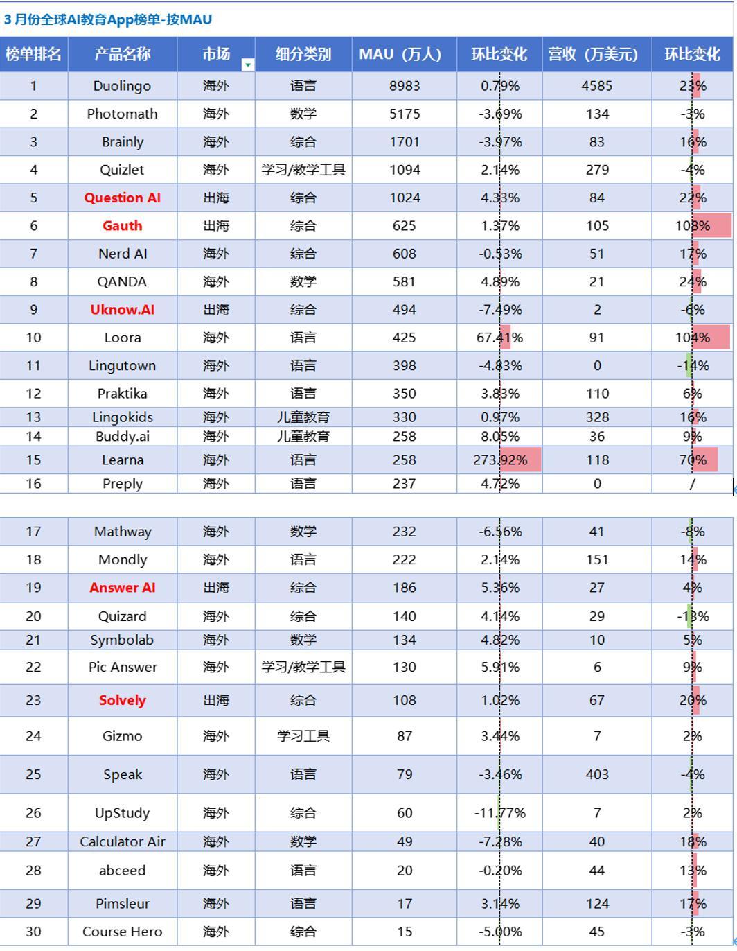 3 月全球 AI 教育 App 榜,标红产品出自华人团队