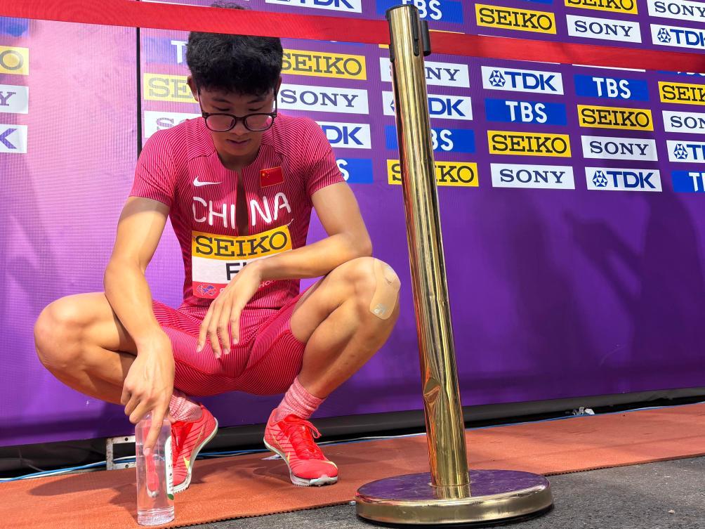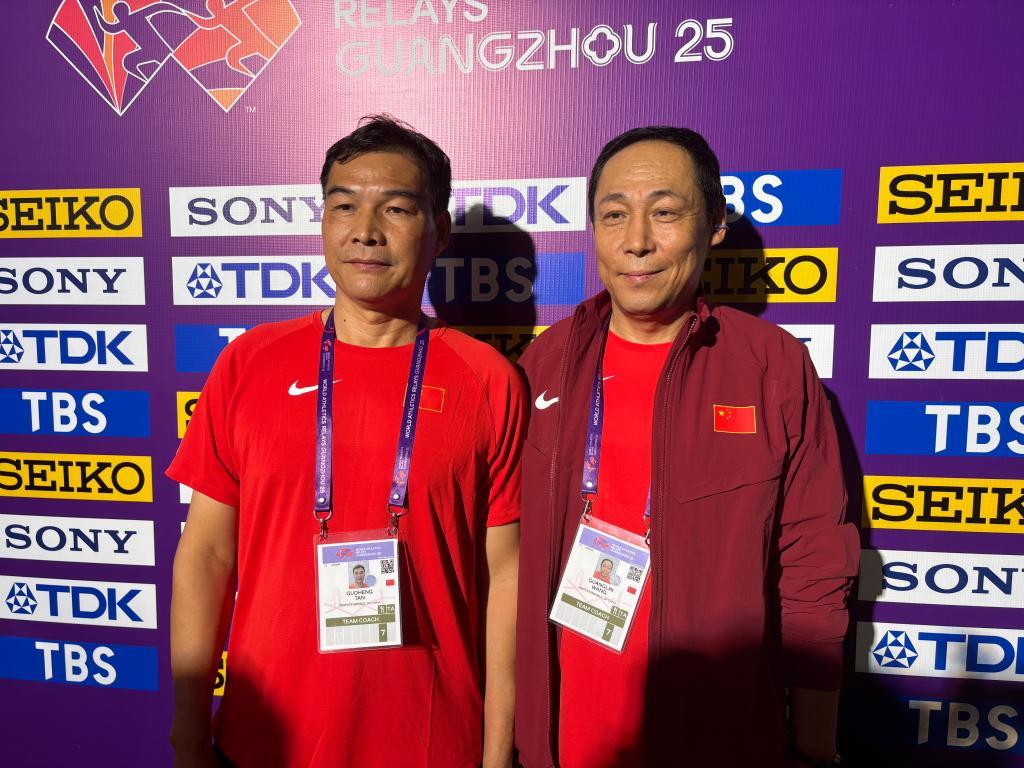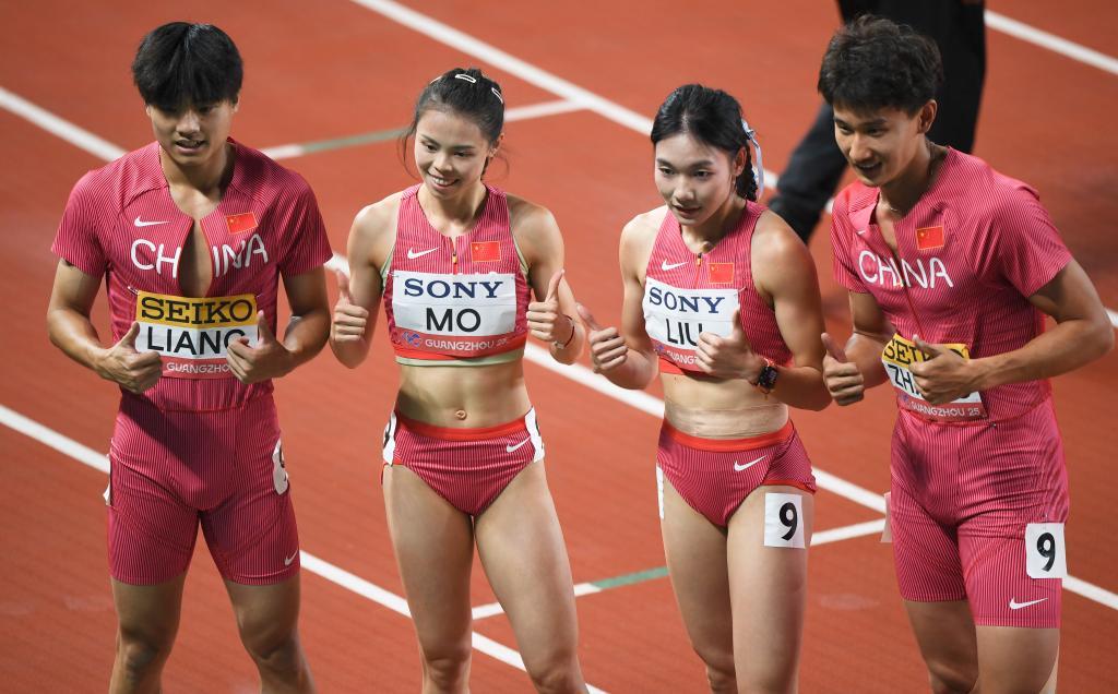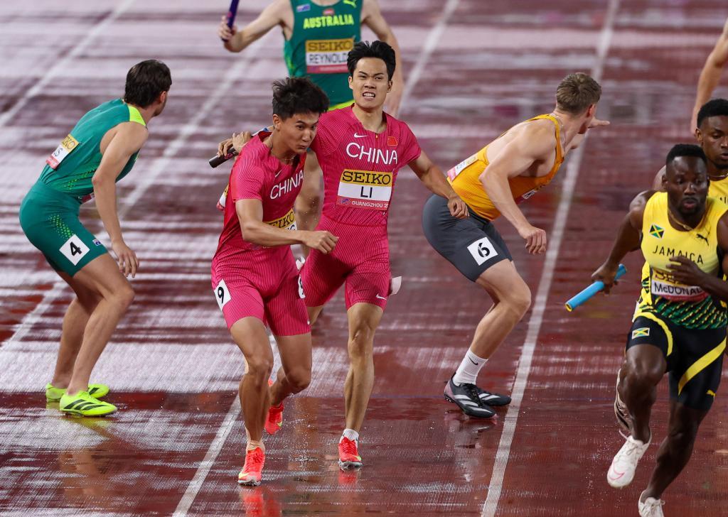 ↑5月10日,中国队第一棒梁宝棠(前)在比赛中出发。新华社记者 李明 摄