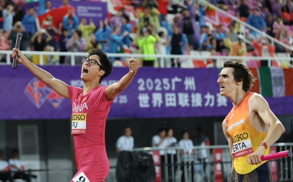 ↑5月10日,中国队第四棒付浩然(左)在冲过终点后庆祝。新华社记者 李明 摄