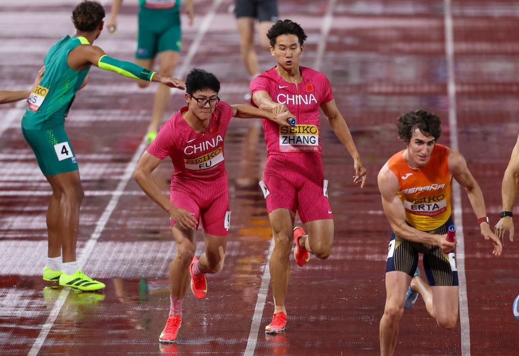 ↑5月10日,中国队第三棒张起宁(中右)与第四棒付浩然(中左)在比赛中交接棒。新华社记者 毛思倩 摄