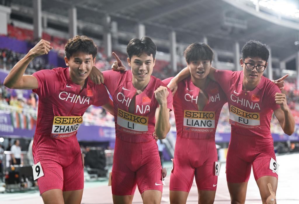 ↑5月10日,中国队第一棒梁宝棠(前右)与第二棒李懿卿(前左)在比赛中交接棒。新华社记者 李明 摄