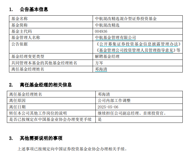 据中航基金5月8日公告,邓海清自5月6日起因公司内部工作调整卸任中航混改精选的基金经理一职,转而由方岑单独接管,邓海清本人则继续担任公司副总经理及首席投资官,但名下已无在管基金。