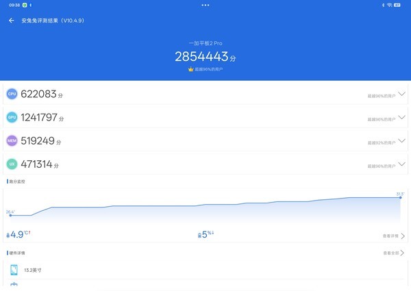 在安兔兔跑分中,我们实测一加平板 2 Pro拿到了2854443分的总成绩,根据安兔兔公布的2025年4月Android平板设备性能榜,一加平板 2 Pro这个分数可以排到第一名。具体到各个子项,一加平板 2 Pro CPU得分622083分,GPU得分1241797分,MEM得分519249分,UX得分471314分,表现非常抢眼。
