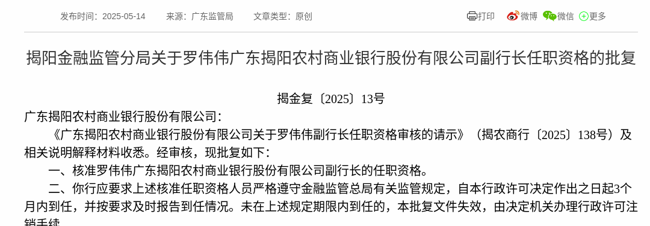 2025 年 5 月 14 日,根据国家金融监督管理总局消息,《广东揭阳农村商业银行股份有限公司关于罗伟伟副行长任职资格审核的请示》获得通过,批复罗伟伟广东揭阳农村商业银行股份有限公司副行长的任职资格。