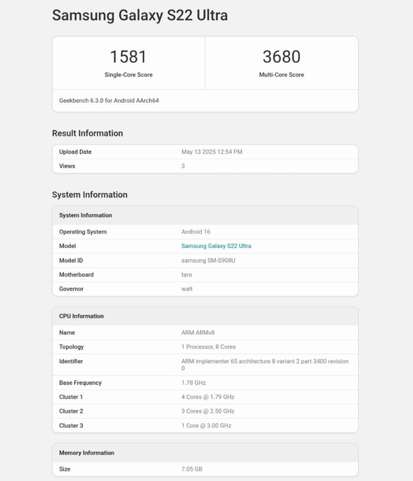 【CNMO科技消息】近日,CNMO从外媒了解到,三星S22 Ultra在Geekbench上被发现运行基于Android 16的One UI 8系统,这标志着下一代重大操作系统更新的开发工作正在迅速推进。据称,该系统的测试版将于本月推出,稳定版预计将于9月发布。
