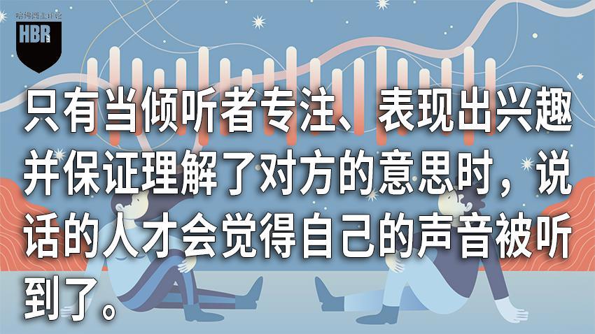 良好的倾听是一项需要投入时间的艰巨任务。研究中我们发现,只有当倾听者专注、表现出兴趣并保证理解了对方的意思时,说话的人才会觉得自己的声音被听到了。