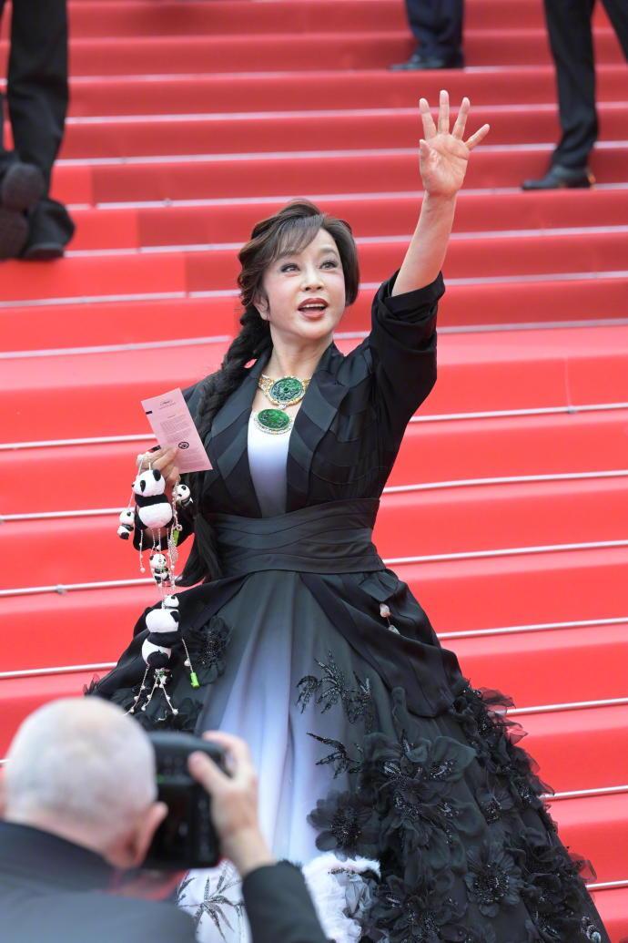 刘晓庆带着一串熊猫玩偶走上戛纳红毯