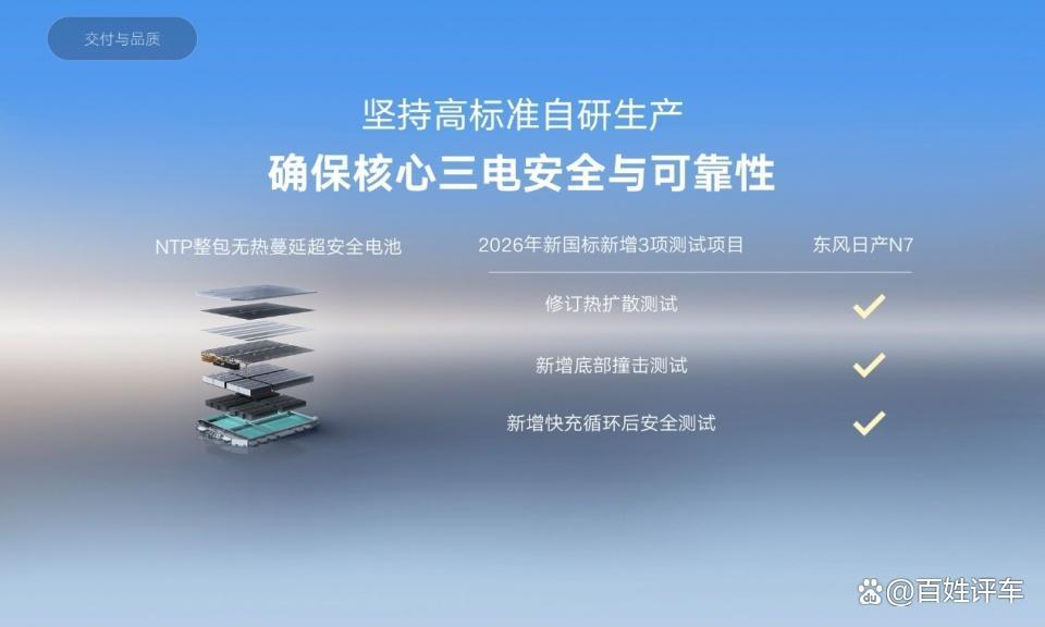 此外,针对用户最关注的三电, 东风日产坚持高标准自主研发生产,最大程度确保安全性与可靠性。根据2026年的新国标,N7搭载的超安全电池不仅24项标准测试全部达标,更提前满足了热扩散、底部撞击、快充循环后安全测试3项新增标准。
