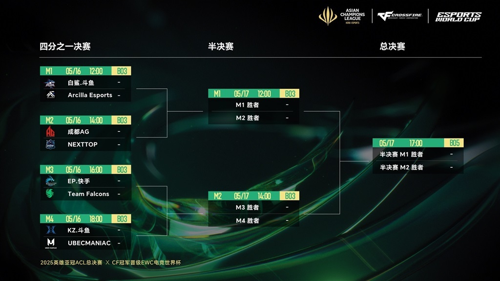 来自CN、菲律宾、越南的八支顶尖战队已集结完毕!5月16日-17日,白鲨、AG、EP、KZ四支CN战队将分别迎战ARC、NT、FAL、UM,八支战队将于5月17日在静安体育中心争夺穿越火线总决赛席位,最终冠军将直通电竞世界杯EWC。