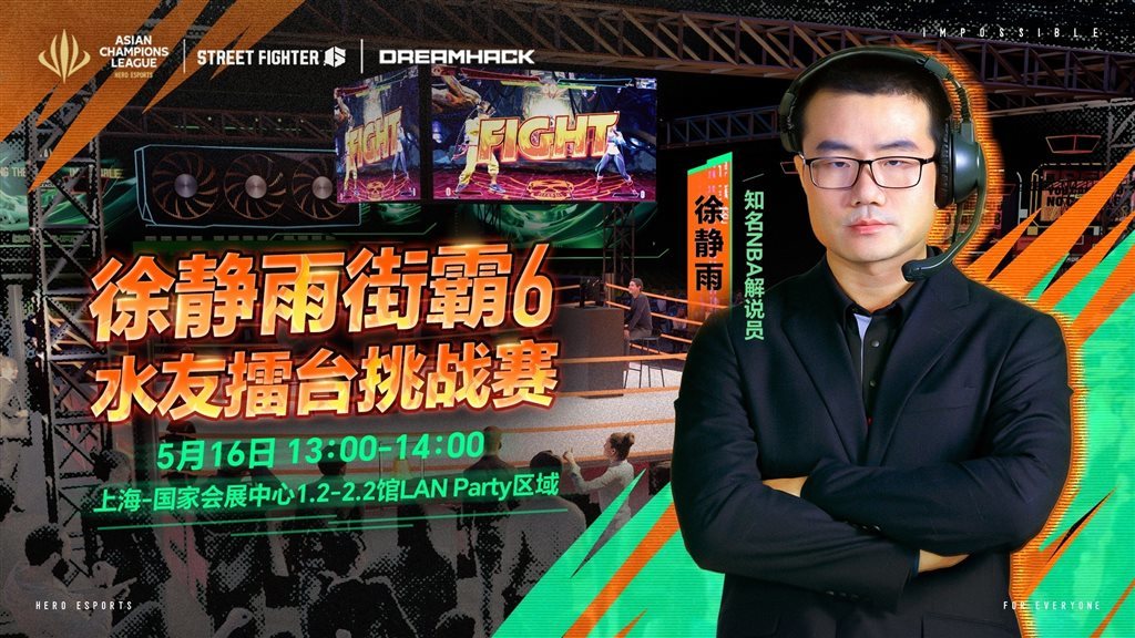 5月16日13:00-14:00,知名NBA解说徐静雨将来到英雄亚冠ACL总决赛x街头霸王6现场,与水友开启擂台挑战赛。这一次,他不聊篮球,只拼操作!无论你是街霸大神还是格斗萌新,都有机会与徐静雨老师1v1擂台对决!