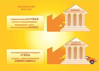 中国人民银行上周宣布,自5月15日起,下调金融机构存款准备金率0.5个百分点(不含已执行5%存款准备金率的金融机构),下调汽车金融公司和金融租赁公司存款准备金率5个百分点。