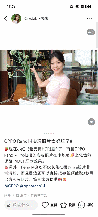 对于经常拍摄和分享内容的朋友来说,Reno14 Pro不仅仅只是能拍摄实况照片,而是将实况照片变成创作的工具。尤其是像现在小红书已经能分享OPPO手机拍摄的HDR照片,所以当我们把这些有意思的Live图在社交平台上分享时,凭借ProXDR技术的加持,照片的动态范围和色彩细节更加丰富,分享效果可以让每一张Live图片都呈现出电影般的质感,能吸引更多朋友和粉丝的点赞与评论。