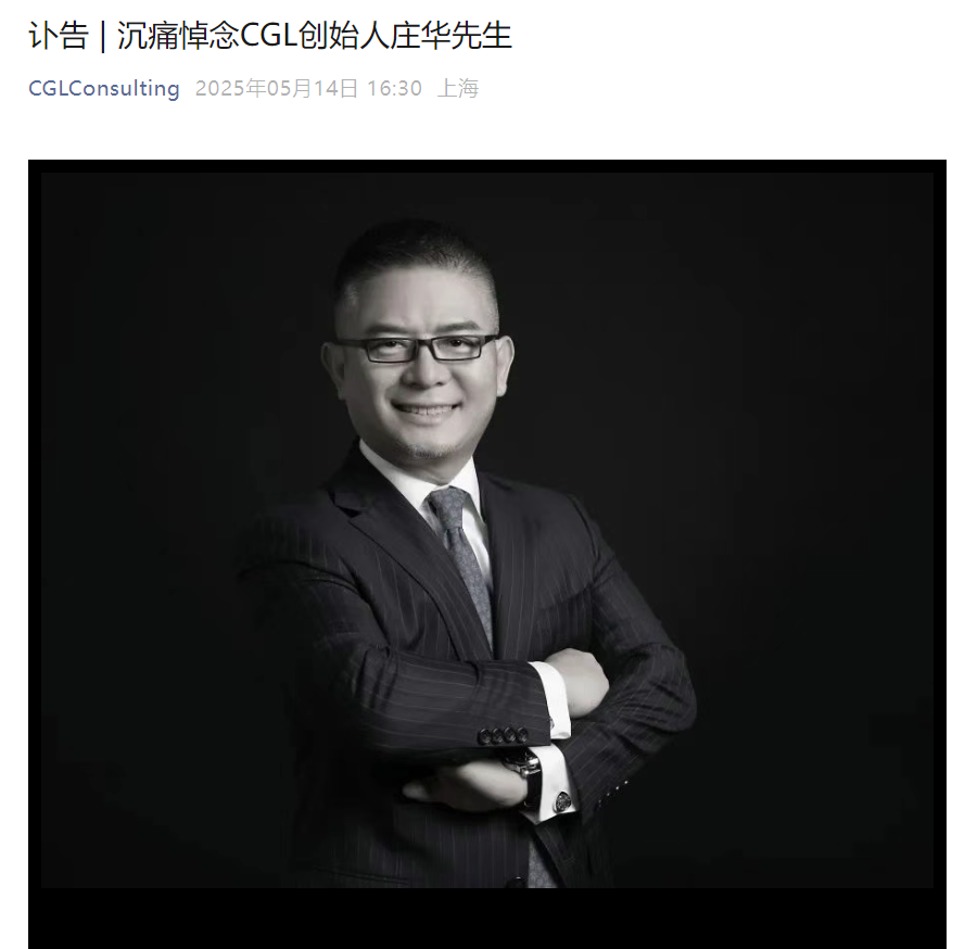 ZAKER财经消息,国内知名猎头公司CGL(上海德筑企业管理有限公司)5月14日发布讣告称,创始人庄华因突发心血管疾病,于5月12日晚在上海去世,享年62岁。
