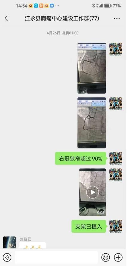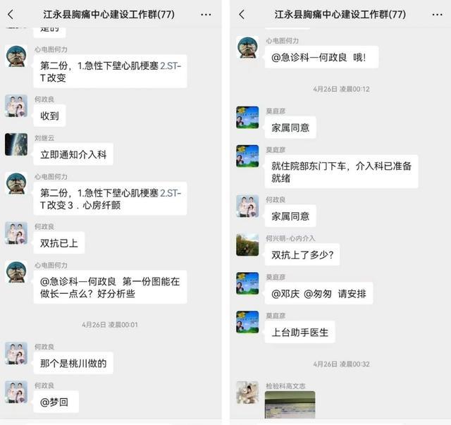 4月25日23时42分,55岁的邹先生因持续胸闷胸痛伴大汗、呕吐等症状,紧急就诊于当地卫生院。心电图检查显示急性下壁ST段抬高型心肌梗死,23时47分检查结果通过5G智慧平台直传至江永县人民医院胸痛中心。