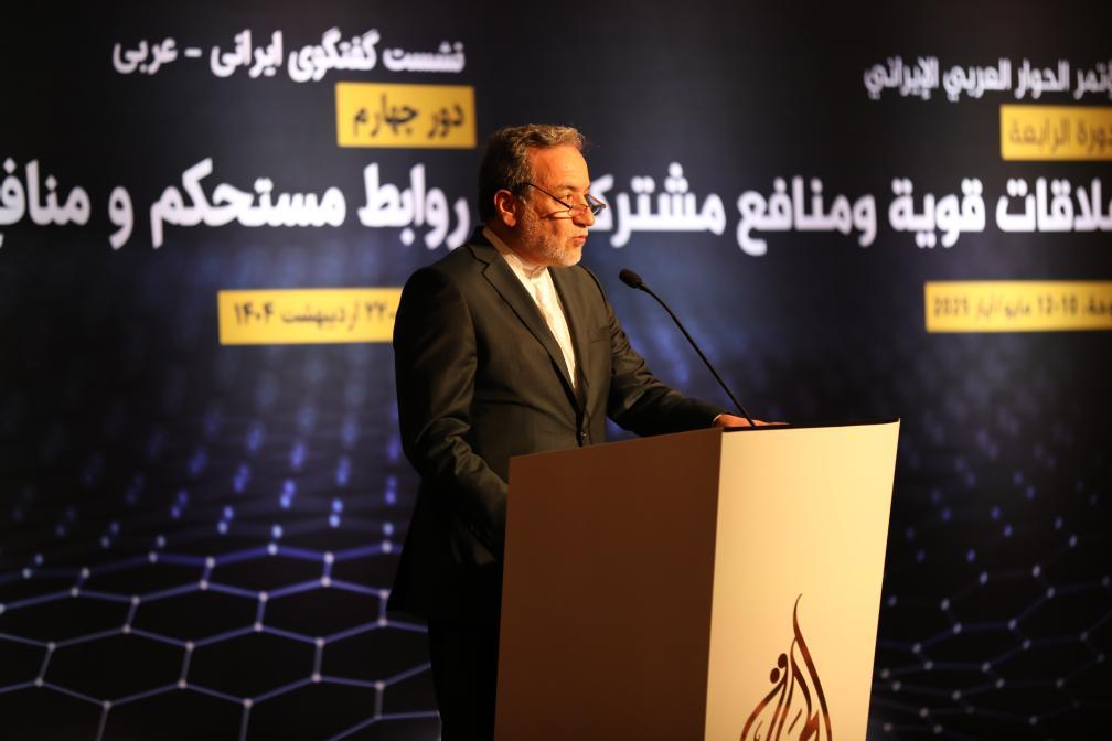 5月10日,伊朗外长阿拉格齐在卡塔尔多哈出席第四届阿拉伯-伊朗对话会议时讲话。新华社发(主办方供图)
