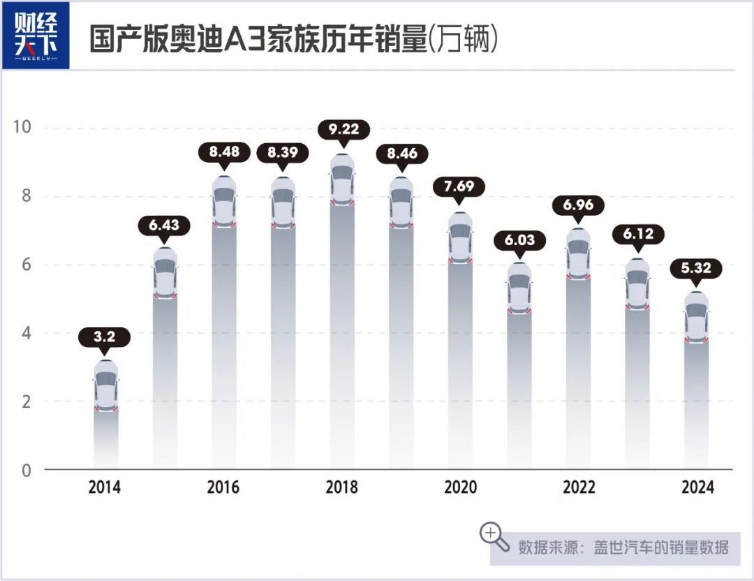 盖世汽车的销量数据显示,2014~2024年,国产版奥迪A3家族的年销量分别为3.2万辆、6.43万辆、8.48万辆、8.39万辆、9.22万辆、8.46万辆、7.69万辆、6.03万辆、6.96万辆、6.12万辆和5.32万辆。易车App数据显示,2025年1~4月,奥迪A3家族的月销量分别为4535辆、3758辆、5682辆和4656辆。可以看出,2019年奥迪A3的销量就过了巅峰期,2021年开始月均销量保持在5000辆左右。