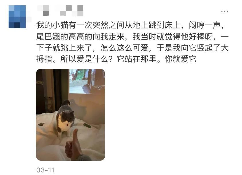 还有人分享过这样一个瞬间:猫突然从地上跳到床上,尾巴翘得高高的、冲着她一声闷哼走过来。