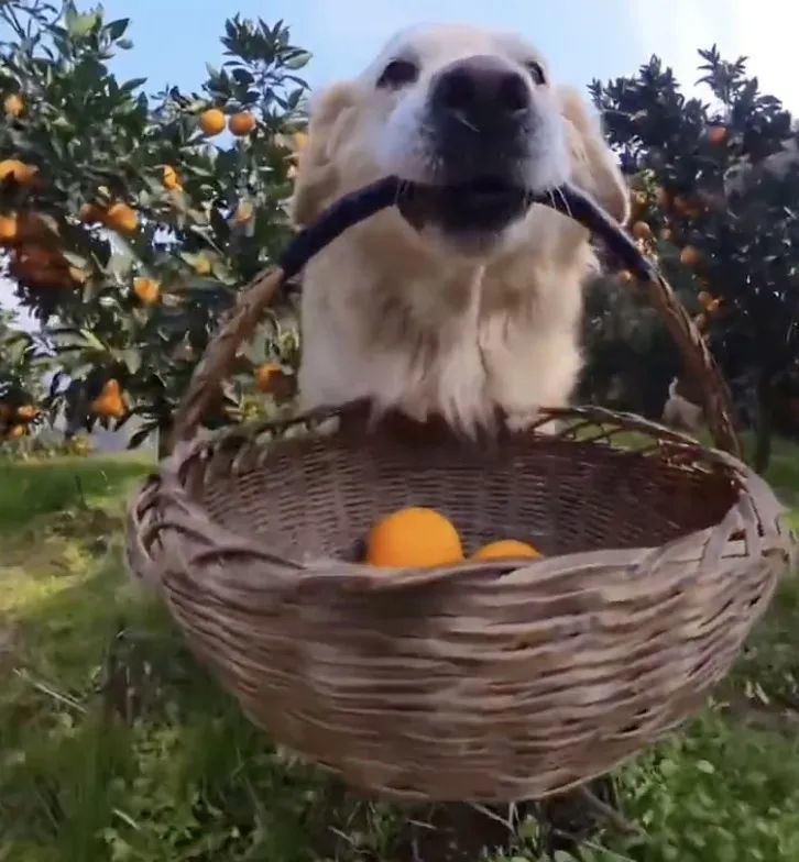 每天,它都穿梭在橙子树下,跟主人一起“上班”。看到它认真摘橙子的样子,主人灵机一动,给它准备了一个小箩筐。