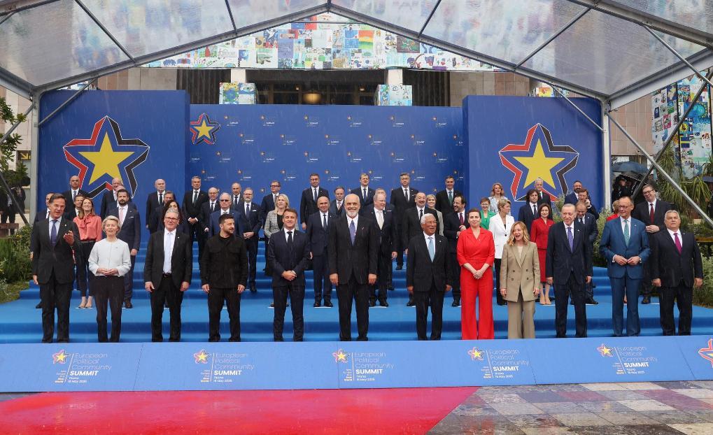 5月16日,在阿尔巴尼亚首都地拉那,出席第六届欧洲政治共同体领导人会议的与会嘉宾参加合影。新华社记者赵丁喆摄