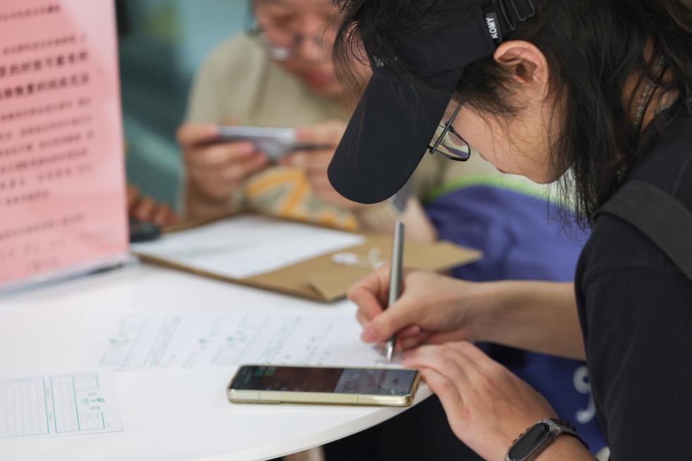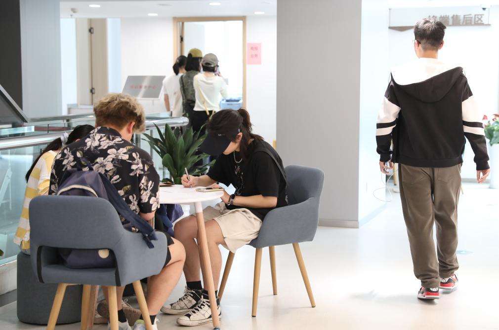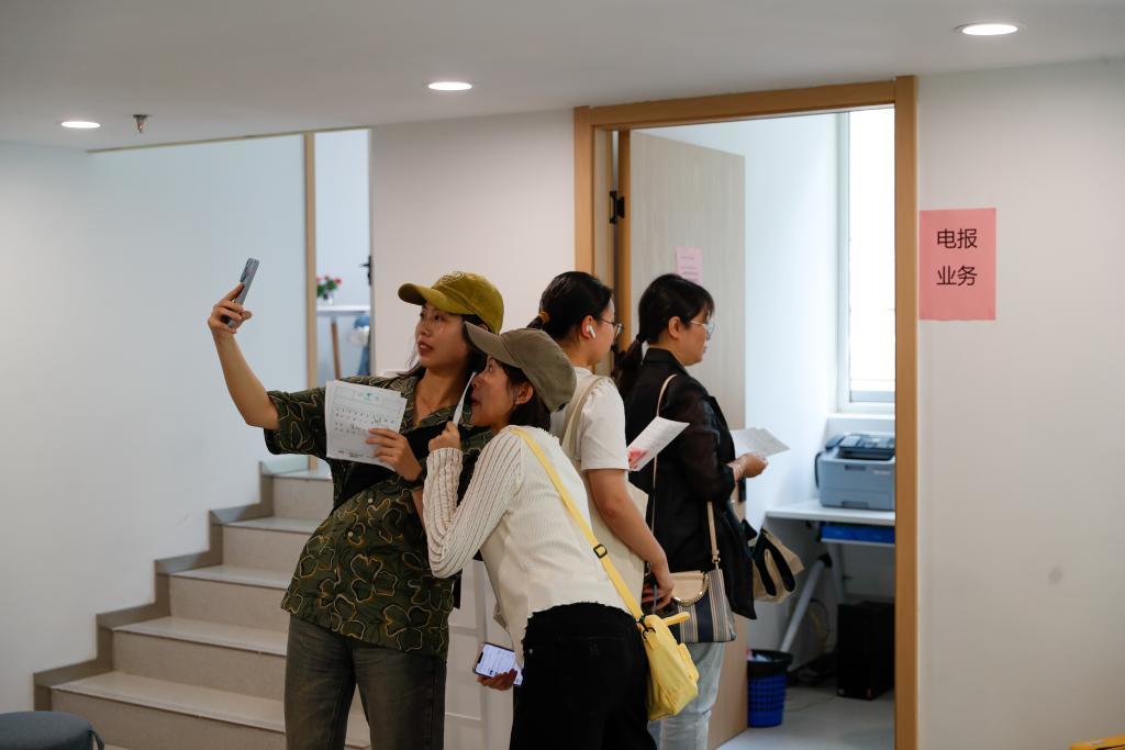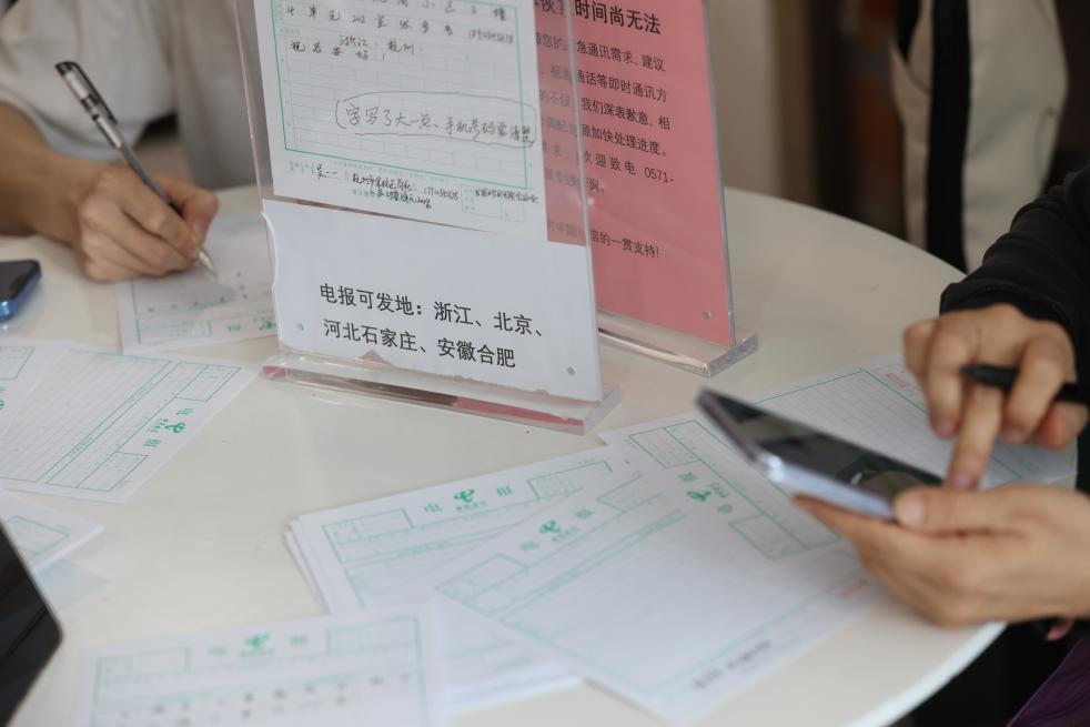 4月10日,人们在中国电信杭州武林广场营业厅电报业务办理专区写电报。