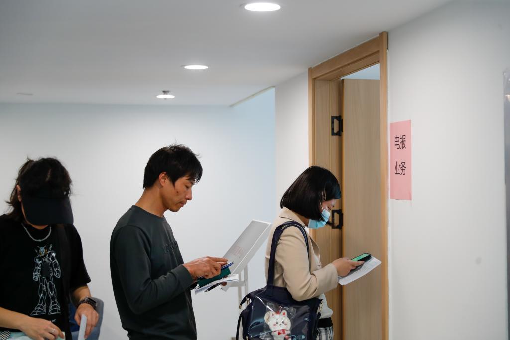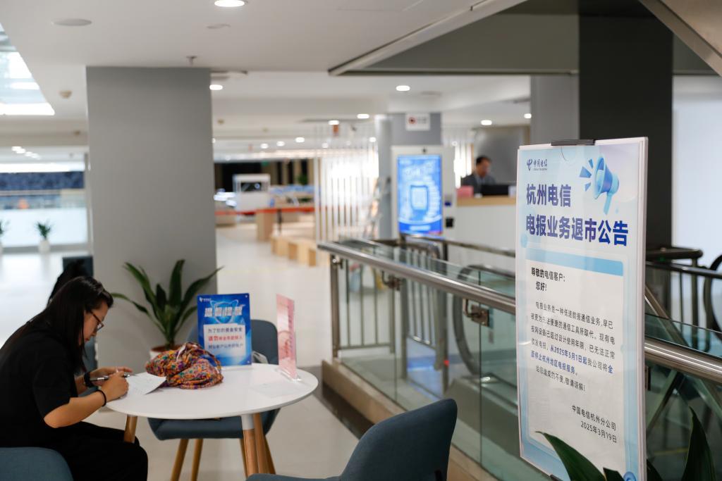 4月10日,在中国电信杭州武林广场营业厅电报业务办理专区,等待办理电报业务的人们排起长队。