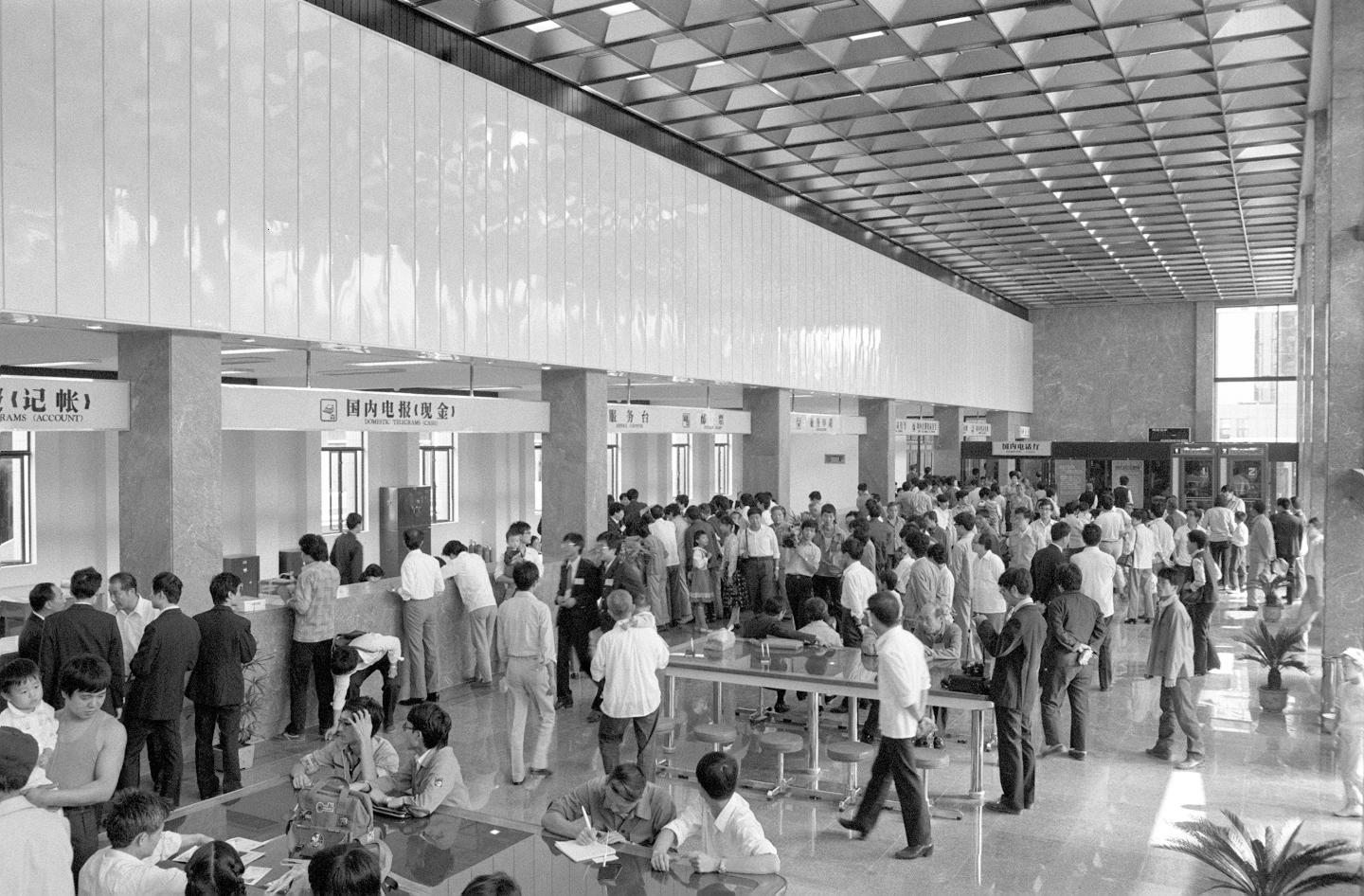 20世纪80年代人们在上海电信大楼内办理业务(资料照片)。