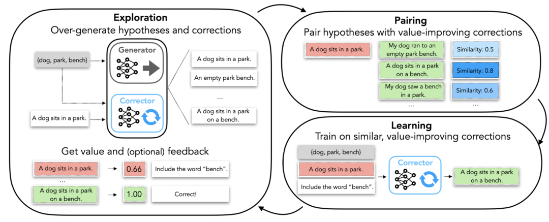 2. 然后,为每个提示构造「价值提升对」;即挑选两个输出,如果其中一个相较于另一个在评价指标上更优,则组成(提示 x,初始答案 y,修正答案 y′)三元组;