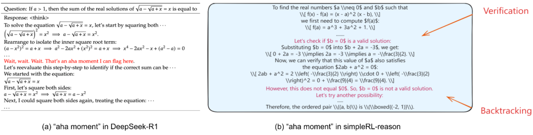 所谓「顿悟时刻」,是指模型能够反思先前的错误,并尝试替代性策略进行修正。这种能力的涌现表明模型具备了类人式的深层思维过程。