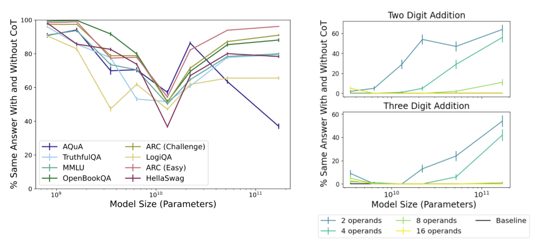 对 CoT 推理的依赖性以使用 CoT 和不使用 CoT 时获得相同答案的百分比来衡量。对于像加法这样的推理任务来说,CoT 的作用更大,而对于更大的模型来说,CoT 的作用也更大。