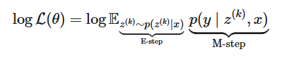 我们的目标是最大化正确答案的边际似然 p (y∣x),给定每个问题的多个推理轨迹 {z (k)} k=1K。
