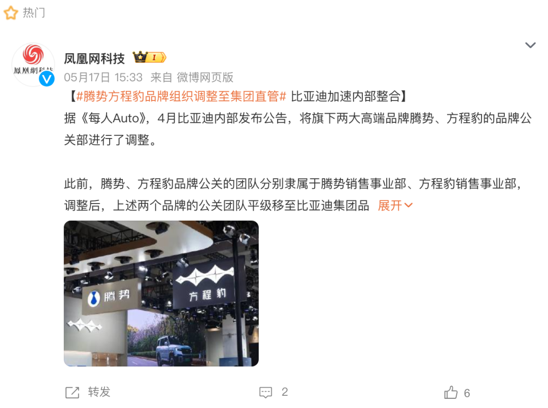 从企业运营的角度来看,公关团队架构调整是比亚迪整合资源、集中发力的关键举措。在过去,腾势方程豹的公关团队分别隶属于各自品牌事业部,这种分散式管理虽然有一定的自主性,但在资源调配和使用效率上存在明显不足,而将公关团队统一划归至集团,能够实现资源的优化配置。在品牌传播上,统一管理能够制定更为全面、系统的传播策略,整合集团旗下所有媒体资源,形成强大的传播合力。通过统一策划品牌宣传活动,利用集团的官方网站、社交媒体账号、线下体验店等多种渠道,全方位、多角度地传播腾势和方程豹的品牌理念和产品优势,提高品牌的知名度和美誉度,实现1+1>2的传播效果。