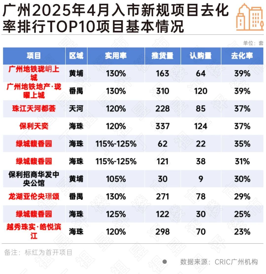 以广州为例,4月全市共有13个新规产品入市,推货量占全市六成,热销去化项目多为首开新盘,产品实用率多超120%,支撑市场去化热度环比持增8pcts至23%。