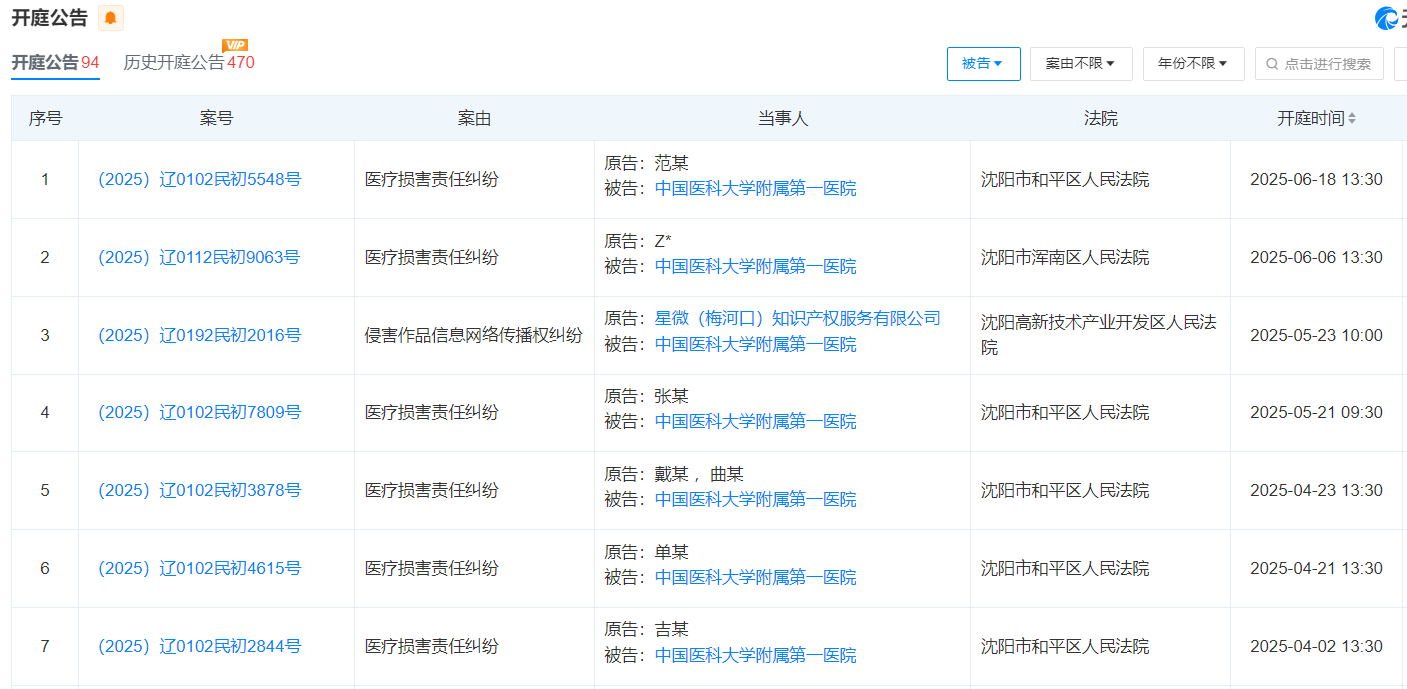天眼查开庭公告还显示,2025年6月6日,中国医科大学附属第一医院同样因医疗损害责任纠纷被告[案号(2025)辽0112民初9063号],在沈阳市浑南区人民法院第三十五法庭开庭审理。6月18日,中国医科大学附属第一医院又因医疗损害责任纠纷被范某告上法庭[案号(2025)辽0102民初5548号],在沈阳市和平区人民法院战友院区三十六法庭开庭审理。