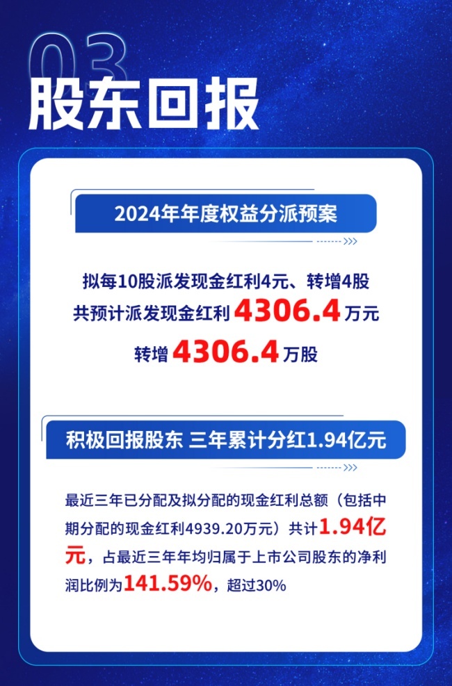 不仅是业绩,在回报股东方面,广厦环能也走在了北交所上市公司前列。公司2024年年度权益分派预案显示,将以未分配利润向全体股东每10股派发现金红利4元(含税),本次权益分派共预计派发现金红利4306.40万元。数据显示,最近三年已分配及拟分配的现金红利总额(包括中期分配的现金红利4939.20万元)共计1.94亿元。