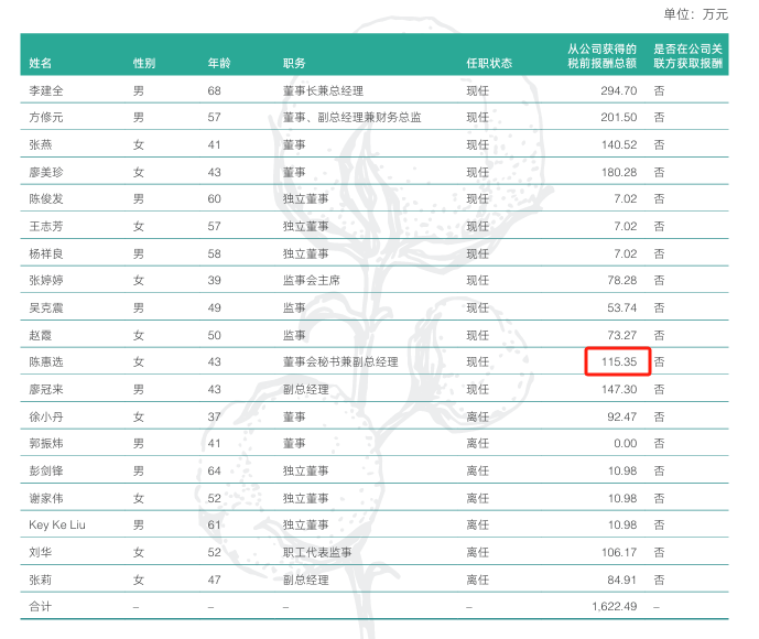 董事会秘书陈惠选2024年薪酬为115.35万元,2023年薪酬为100.34万元,涨薪15.01万元。2022年薪酬为107.92万元。