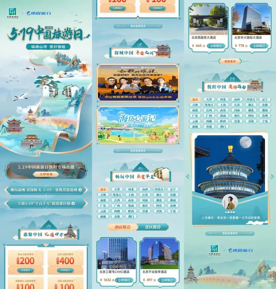 此外,携程“锦绣山河,美好旅程”中国旅游日专题活动页面也于5月19日正式上线。专题页开设了全国30多个省市、自治区、直辖市专属页面,聚合所在地热门酒店、景区及旅游线路推荐,让用户可一站获取目的地旅游攻略及优惠产品。