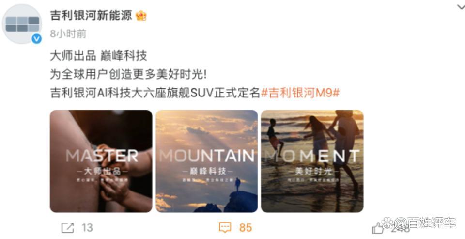 近日,吉利银河全尺寸旗舰SUV正式定名为"吉利银河M9",定位"AI科技大六座旗舰SUV"。