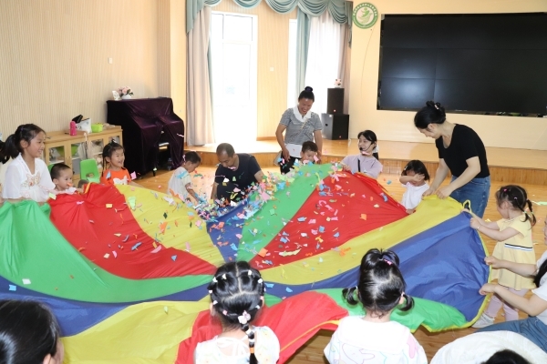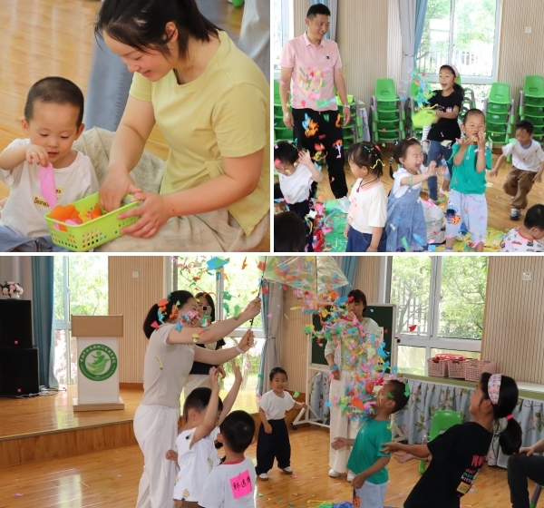 最令人期待的“快乐时光”当属“色彩大爆炸”环节。孩子们拿起彩纸,用力撕下小块,抛向空中,顿时“彩色雪花”纷纷扬扬,教室变成了梦幻的童话世界,孩子们在游戏中锻炼手部精细动作,感受色彩带来的快乐;接着,五颜六色的气球被吹起,孩子们追着气球奔跑、拍打,锻炼了视野追踪能力在轻松的氛围中,孩子们尽情释放活力,体验到幼儿园生活的无拘无束。