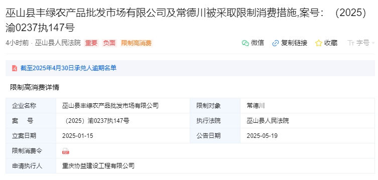 近日,巫山县人民法院对巫山县丰绿农产品批发市场有限公司(以下简称“巫山丰绿市场”)及其法定代表人常德川发出限制消费令(案号:(2025)渝0237执147号),原因是该公司未履行与重庆协益建设工程有限公司的建设工程合同纠纷案判决义务。值得注意的是,巫山丰绿市场由中国农业发展银行通过旗下中国农发重点建设基金有限公司持股79.52%,具有国资背景。然而,近一年来,该公司已累计涉及16起风险事件,其中包括12次限制高消费和4起司法案件,经营风险持续暴露。