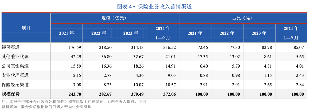根据联合资信的评级报告,2024年前三季度,招商信诺372.06亿元的规模保费中,有316.52亿元来自银保渠道,占比超85%;其余渠道均占比不高,其他兼业代理渠道,即与银行信用卡中心合作的电销模式,在2024年前三季度累计贡献规模保费21.02亿元。联合资信表示,受信用卡发卡量下滑及公司营销策略转型等因素的影响,其他兼业代理渠道保费收入规模及占比均呈逐年下降趋势。