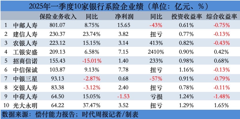 时代周报记者根据一季度偿付能力报告梳理,2025年一季度,10家银行系险企共计实现保险业务收入2027.78亿元,同比增长8.12%。按保险业务收入规模从大到小排序,分别为中邮人寿、建信人寿、农银人寿、工银安盛、招商信诺、中信保诚、中银三星、交银人寿、中荷人寿、光大永明。