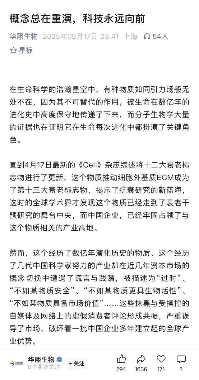 在老板的亲自坐镇下,华熙生物一改过往技术派的保守姿态,以“贴身肉搏”的打法重塑舆论场:从官方微信公众号深夜发文炮轰券商“唱衰”玻尿酸,到联动行业协会强调技术壁垒,攻势密集且精准。