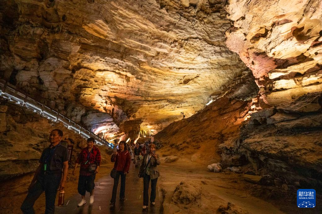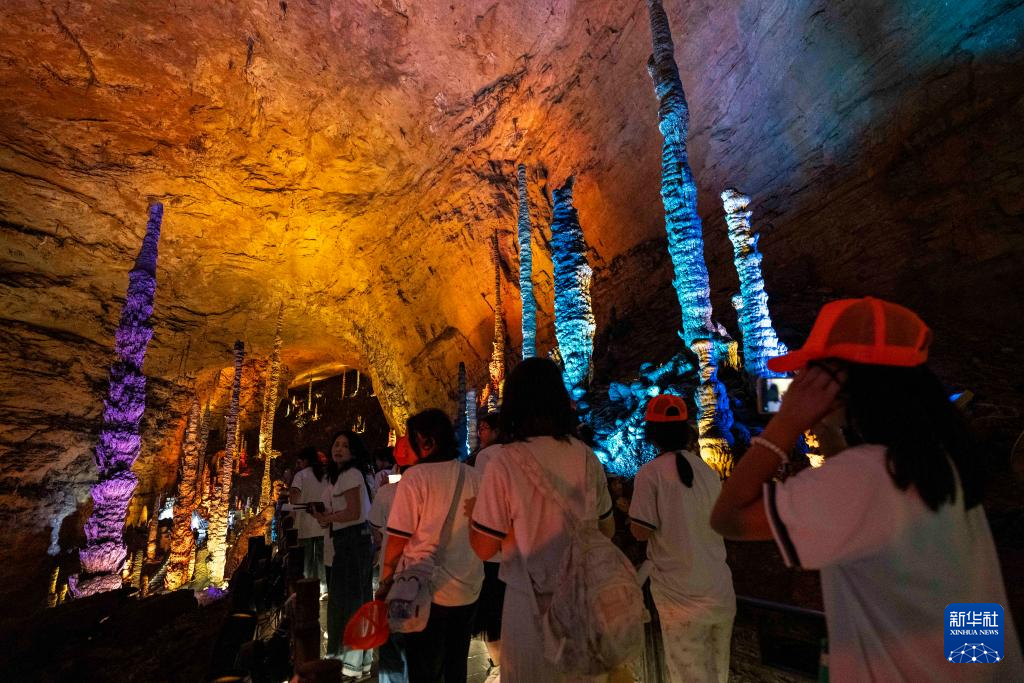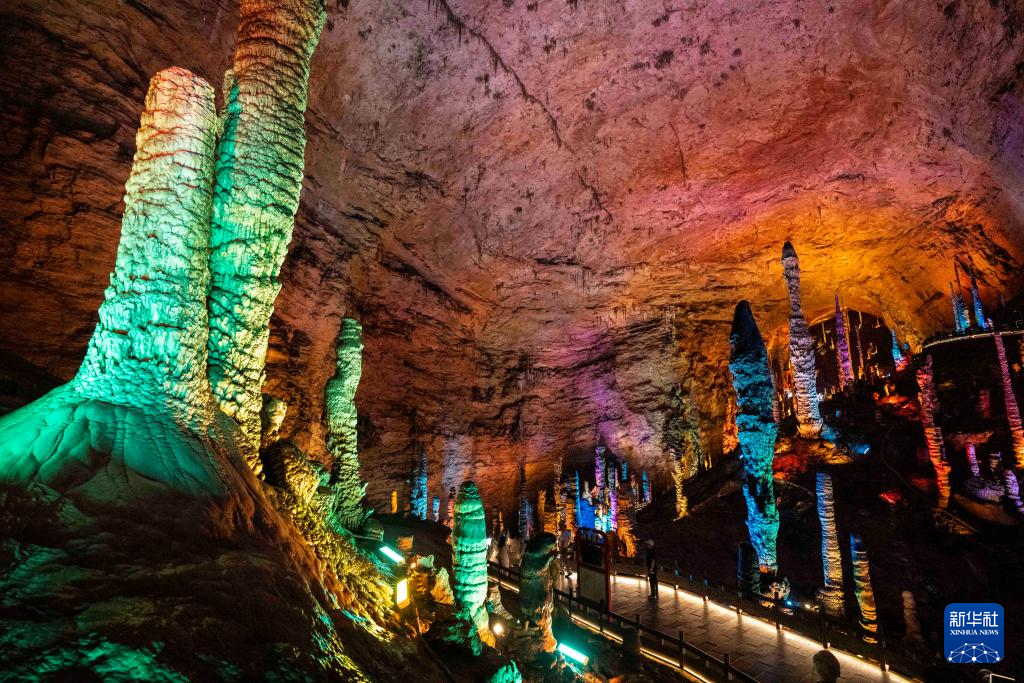这是5月20日在张家界黄龙洞景区拍摄的光影照射下的溶洞景色。