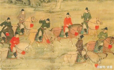 五代画家赵喦《八达游春图》(局部),画中八人头戴官帽,身穿红、紫、绿色官服,骑着骏马在苑林中春游
