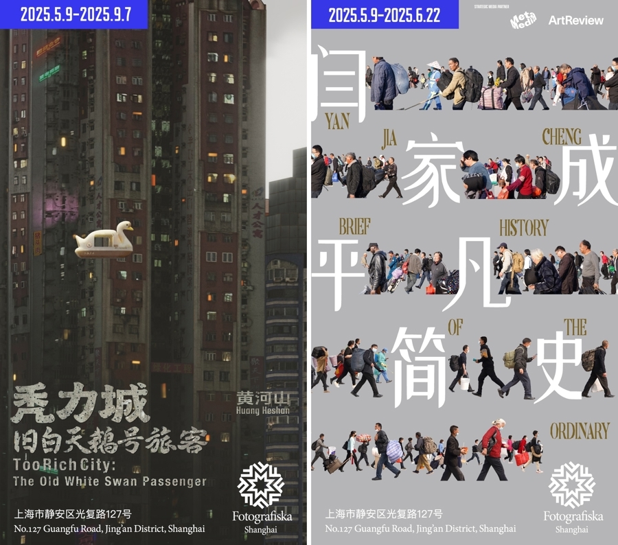 展览海报:黄河山个展《秃力城:旧白天鹅号旅客》(左),闫家成《平凡简史》(右)。